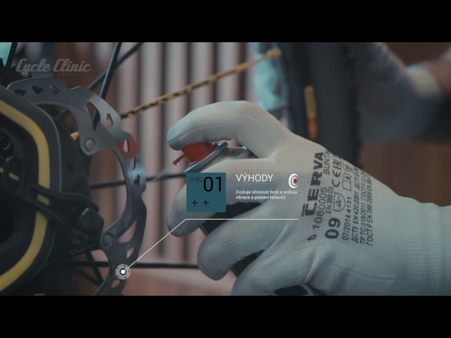 CYCLE CLINIC DISC CLEANER je profesionálny čistič určený predovšetkým pre brzdové kotúče bicyklov. Vďaka rýchlemu a dokonalému odstráneniu prachu, mastnoty a ostatných nečistôt z kotúčov sa zlepší účinnosť bŕzd. Čistič sa rýchlo odparuje a nezanecháva akékoľvek zvyšky nečistôt. Je šetrný pre gumu, plast, eloxované kovy, karbón a povrchové laky.